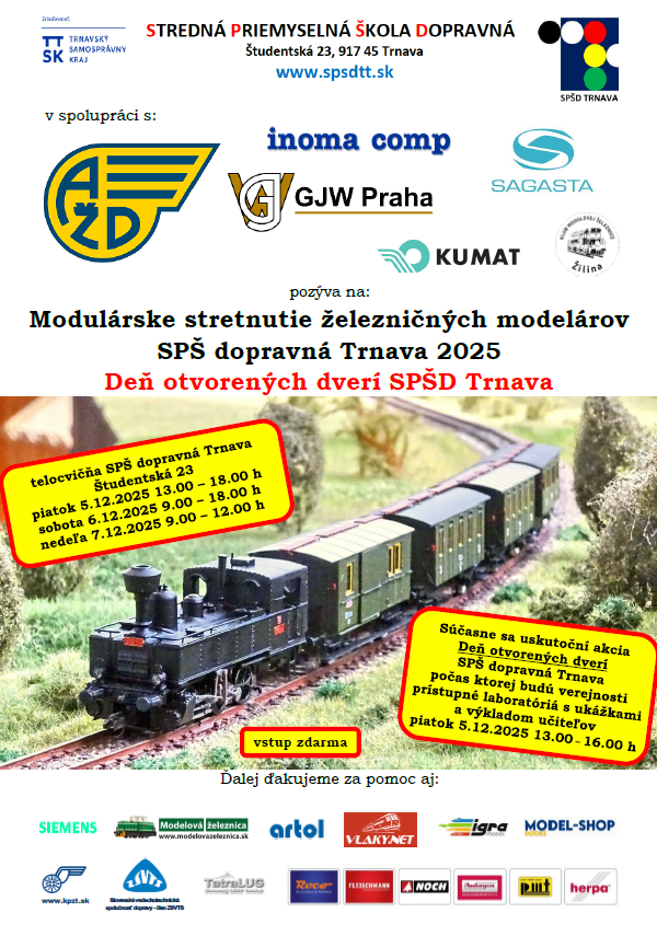 2. 9:00 h - 10:00 h - 11:00 h - vstupy na prehliadku školy, odborných učební jednotlivých úsekov, ukážky prác žiakov, prezentácia partnerských organizácií.Stredná priemyselná škola dopravná, Trnava